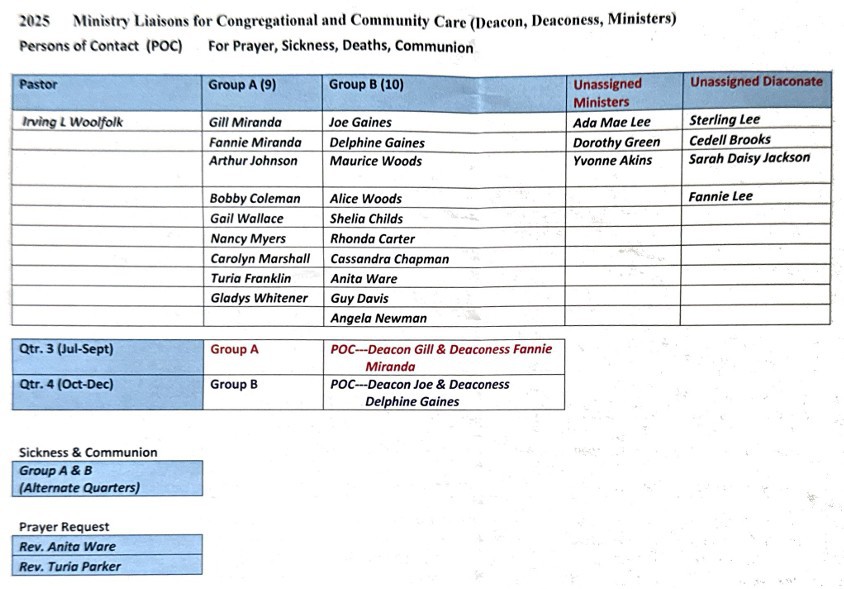 PLEASE UTILIZE THE BELOW CONTACT CHAIN TO REPORT SICKNESS, DEATHS, etc. SO THE PASTOR IS AWARE. updated 7-18-25