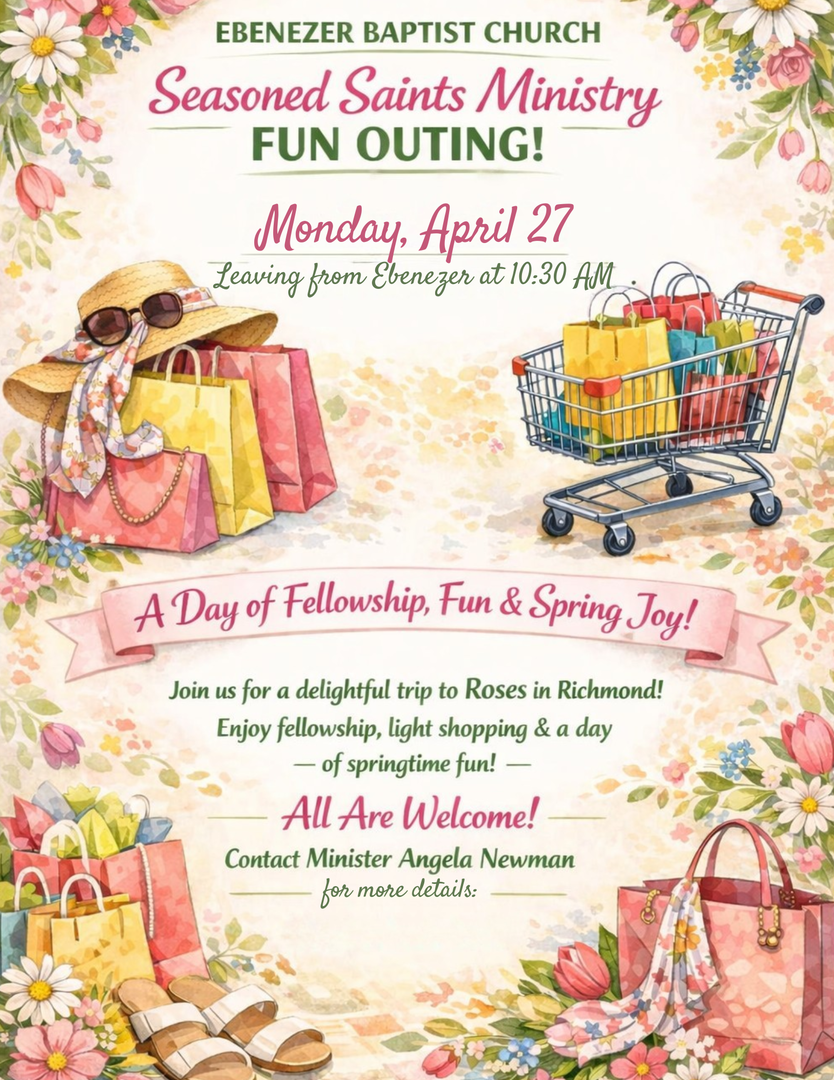 To empower our Seasoned Saints to continue growing spiritually, building meaningful community, and serving with purpose. Through fellowship, discipleship, mentoring, and outreach, we celebrate their wisdom, strengthen their walk with Christ, and create opportunities for them to share their faith, gifts, and life experiences in ways that bless the church and inspire future generations.