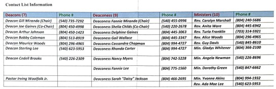 PLEASE UTILIZE THE BELOW CONTACT CHAIN TO REPORT SICKNESS, DEATHS, etc. SO THE PASTOR IS AWARE. (updated 7-18-25)