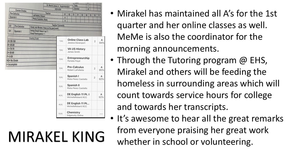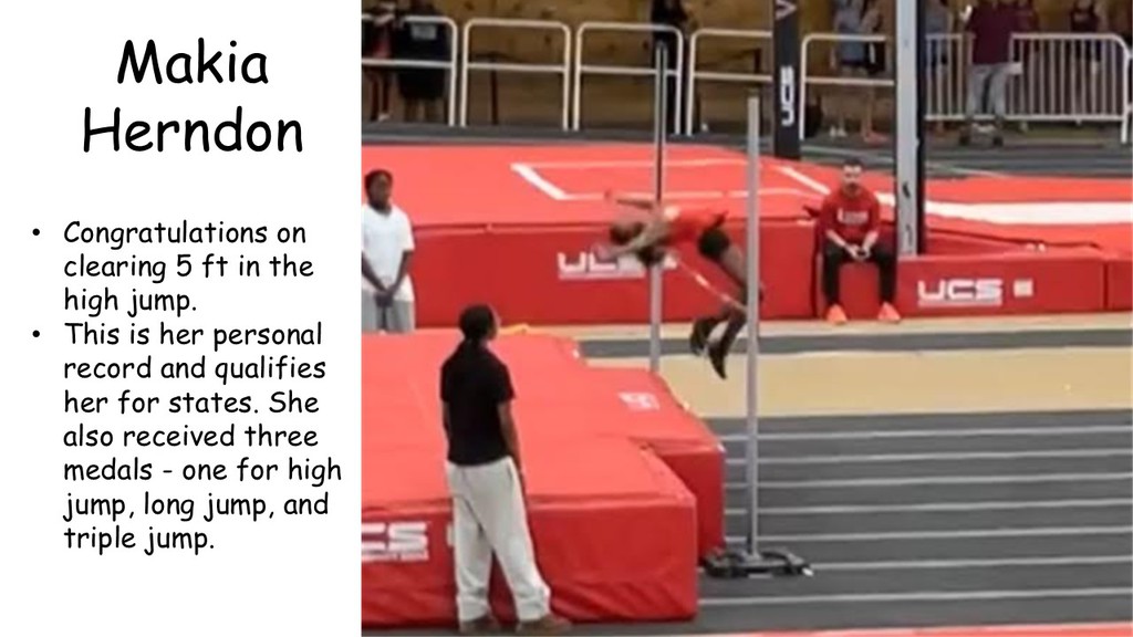 Makia Herndon came in 2nd place in High Jump in the Class 4 State Championship Competition. Also setting a new personal record of 5'2. Add:: Mirakel made all As and a B plus on this reporting period . And 96% on her Online Spanish course..Also made the newspaper for great performance as left fielder for Varsity softball.